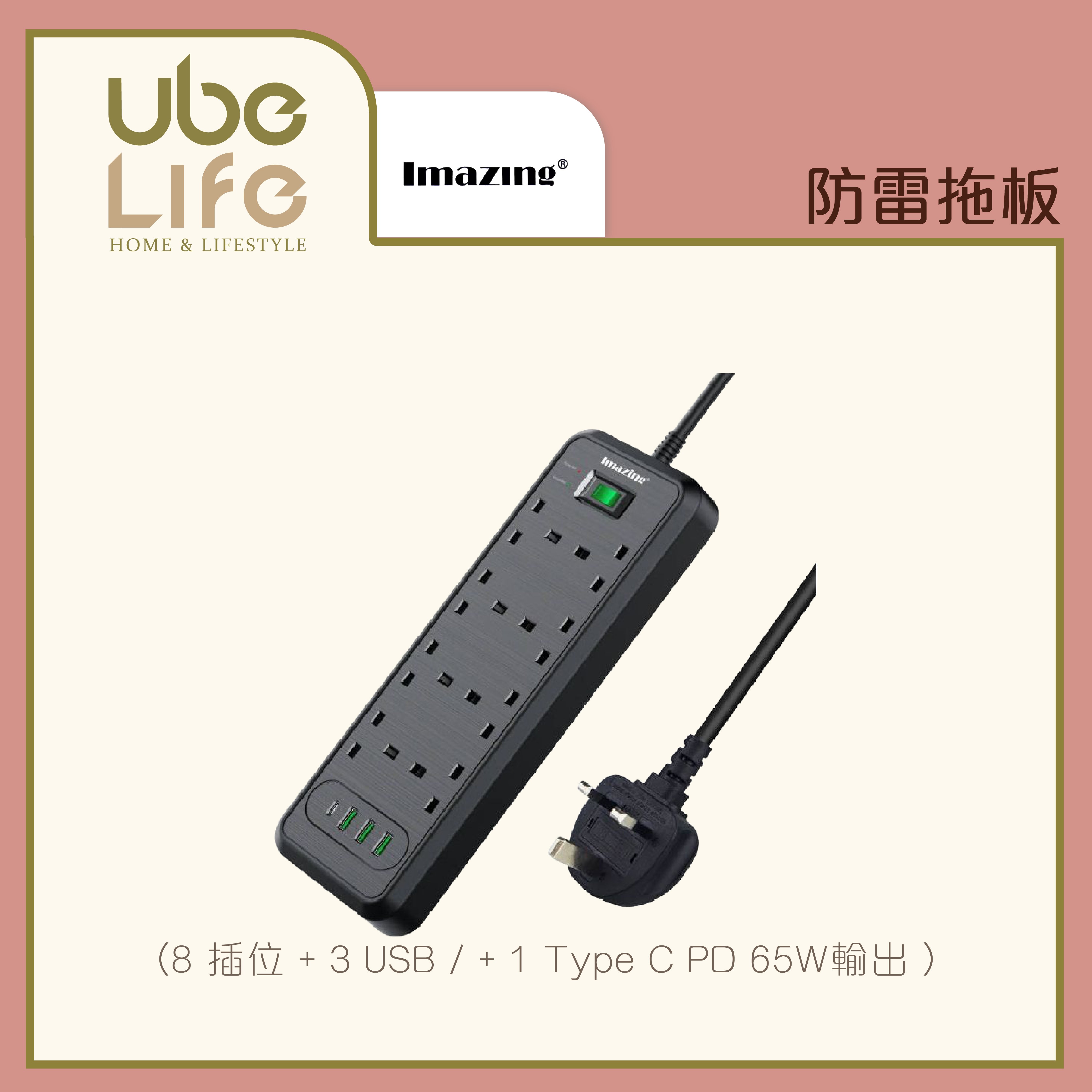 Imazing 防雷拖板 - 8 插位 + 3 USB / + 1 Type C PD 65W輸出 (12個月保養)