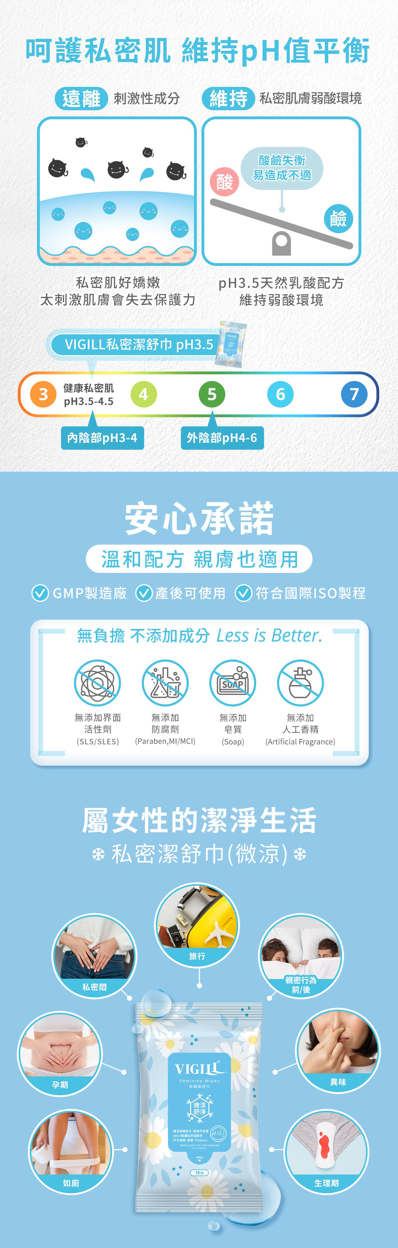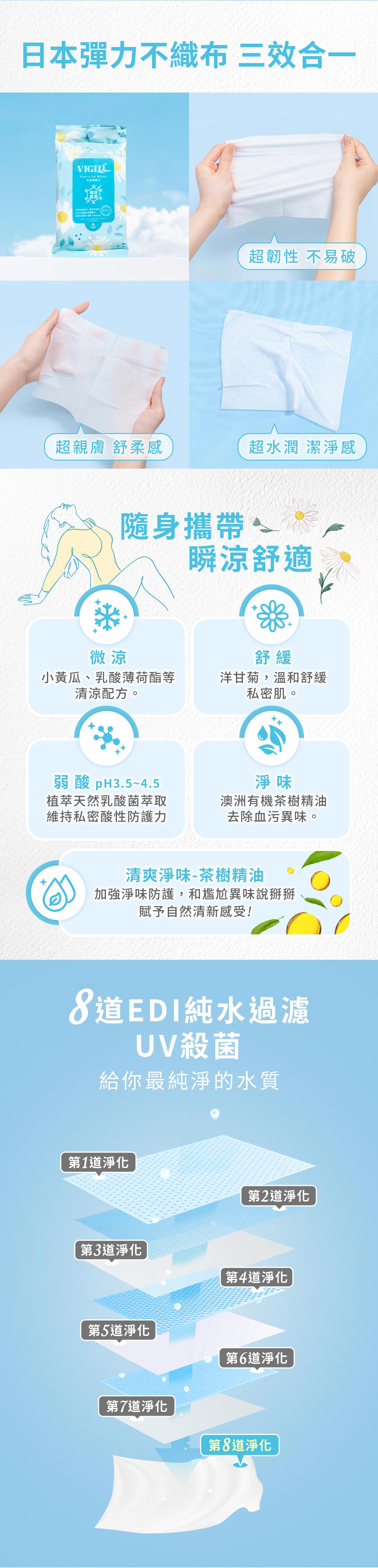 ★ 微涼舒適:含小黃瓜和乳酸薄荷酯等清涼成分,用後感覺微涼舒適。 ★ 弱酸防護:pH值3.5~4.5,含植物萃取的天然乳酸菌萃取(Ferment Filtrate),維護女性私密部位的酸性防護力。 ★ 柔軟舒適:採用日本織法的柔軟不織布,如廁後輕擦私密處,乾淨柔嫩。 ★ 淨味舒緩:使用純淨RO逆滲透水和植物萃取的天然乳酸菌,特別含有澳洲有機茶樹精油,能加強舒緩並去除血污異味,適合平日、外出清潔及生理期使用。
