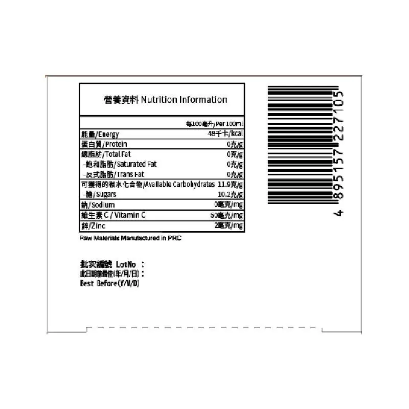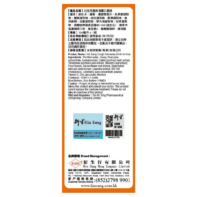 純化水、蜂蜜、濃縮雪梨汁、枇杷葉提取物 、藿香提取物、桔紅提取物、桑葉提取物、 食用香精 、桔梗提取物、胖大海提取物、甘草提取物 、長雙歧桿菌長亞種BR-108(後生元)、接骨木莓濃縮果汁粉、維生素 C 、葡萄糖酸鋅、 薄荷腦